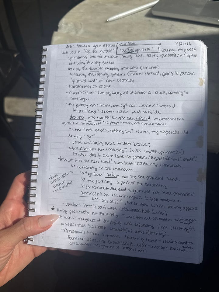 Lech Lecha- last week’s torah parsha. It translates to “go forth”, “go for yourself” or perhaps more accurately “go to yourself”. I think that I’m going to create a second post soon, completely focused on Lech Lecha (comment if you want it). On my Instagram stories, I posted a picture of my handwritten notes about this week’s parsha, and so many of you wanted me to type up/share all of my notes filled with gematria, everything I underlined and highlighted from different sources, and a glimpse into scribbles from my texts with my rabbi and most learned friends, so I think that’s what I will do :)